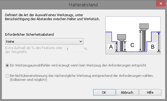 Verwenden Sie das Dialogfeld Halterabstand zur Angabe eines zusätzlichen Abstands für die automatische Werkzeugauswahl durch FeatureCAM, um Kollisionen des Werkzeughalters zu verhindern.
