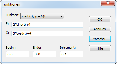 Wählen Sie in der Auswahlliste Funktionen den Eintrag x=F(t), y=G(t) aus. Diese Option dient zum Modellieren parametrischer Funktionen.