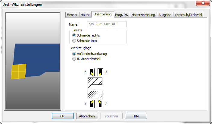In der Registerkarte Ausrichtung können Sie die Orientierung des Halters in der Maschine und die Händigkeit des Werkzeugs einstellen.