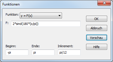 Wählen Sie die Art der Funktion, die Sie erstellen wollen, in der Funktionsliste aus. Benutzen Sie y = F(x), um y als eine Funktion von x und x = F(y) um x als eine Funktion von y zu spezifizieren.
