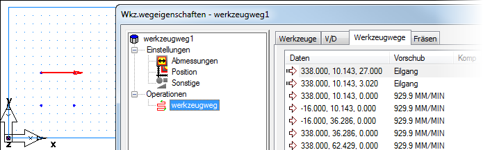 Der Werkzeugweg wird als eine Reihe von Punkten dargestellt. Wenn Sie in der Tabelle eine Zeile auswählen, wird die entsprechende Bewegung im Grafikfenster hervorgehoben.