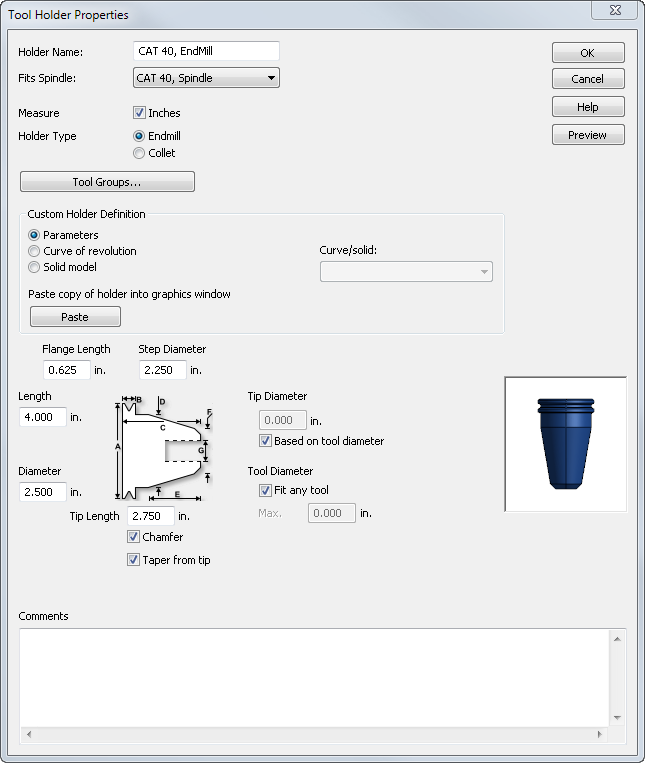 Messen - Wählen Sie das Kontrollkästchen Zoll aus, wenn die Werkzeughalterbemaßungen in Zoll vorliegen. Lassen Sie das Kontrollkästchen für metrische Einheiten deaktiviert.