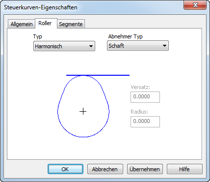 - Wählen Sie den Abnehmer-Typ für den mit dem Nocken verwendeten Abnehmer aus. Dabei können Sie zwischen Ebene oder Roller wählen.