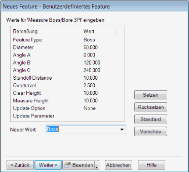 Überfahren — Geben Sie die Distanz vom nominalen Tasterpunkt bis zum Ende des Taster-Anschlags ein oder wählen Sie sie aus.