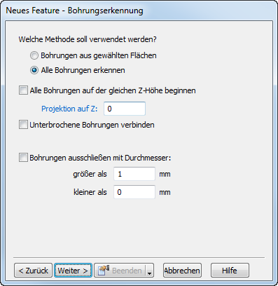 Die Bohrungserkennung Seite ermöglicht Ihnen, zu wählen ob Sie eine oder alle Bohrungen des aktuellen Setup erkennen lassen wollen.