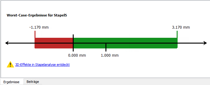 In der folgenden Abbildung ist ein Beispiel für ein 1D-Problem dargestellt. Es wird keine Warnmeldung angezeigt, da der Toleranzstapel der Bauteile in einer einzelnen linearen Richtung erfolgt.