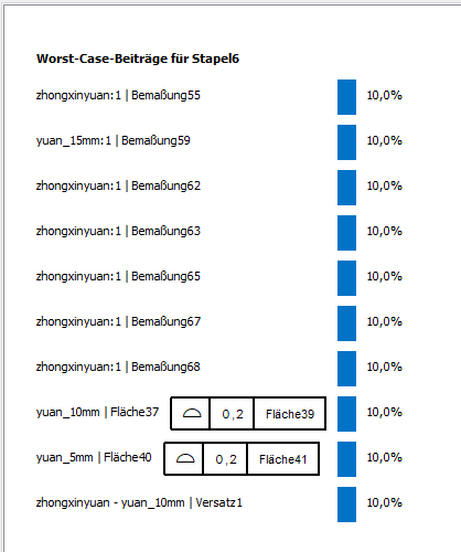- Baugruppenverschiebungs-Einflussfaktoren, die die Zwischenräume zwischen Bauteilen darstellen, sowie die Namen der Elemente, zwischen denen die Verschiebung auftritt.