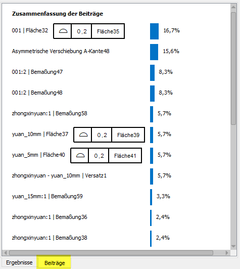 Sie können des Weiteren den Beitrag der einzelnen Bemaßungen anzeigen, indem Sie die Registerkarte Beiträge am unteren Rand der Tabelle auswählen, um das Diagramm mit den Beiträgen anzuzeigen. Dies kann Ihnen dabei helfen, zu bestimmen, welche Toleranz zuerst reduziert werden soll, wenn zu viele Abweichungen prognostiziert werden. Die Liste der Bemaßungen und Toleranzen, die den Stapel beeinflussen, und deren relativer Beitrag werden von größtem zu kleinstem sortiert.