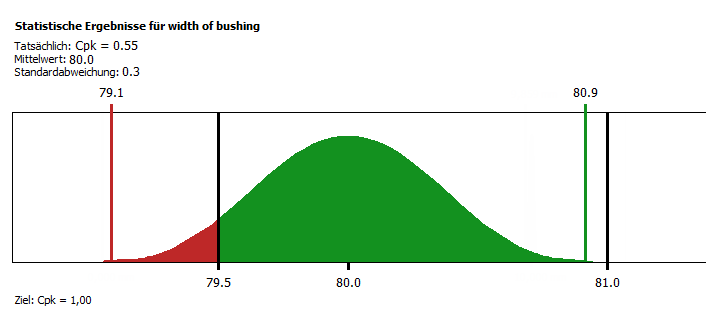 - Die Zahlen über dem Diagramm stellen die oberen und unteren berechneten Grenzwerte der Kurve auf dem gewünschten Qualitätsniveau, das unter dem Diagramm aufgeführt ist, dar, in diesem Fall ist dies ein Cpk-Wert von 1.0.