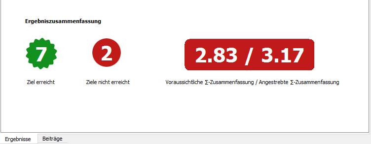 Am unteren Rand der Gruppe Toleranzanalyse befindet sich die Gruppe Ergebnisse. Wenn mehrere Stapel vorhanden, jedoch keine ausgewählt sind, werden in der Gruppe Ergebnisse eine Zusammenfassung der Anzahl der erreichten bzw. nicht erreichten Ziele sowie eine Qualitätszusammenfassung unter Verwendung der bevorzugten Qualitätskennzahlen, die in den Einstellungen festgelegt wurden, angezeigt.
