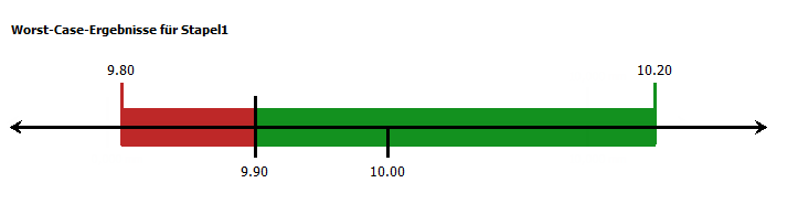 Die Zahlen über dem Diagramm geben den oberen und unteren Grenzwert an und stellen den Stapel am angegebenen Qualitätsziel dar. Der Bereich des Diagramms, der sich innerhalb der Spezifikationsgrenzen befindet, wird grün dargestellt, und der Bereich außerhalb der Grenzen wird rot angezeigt.