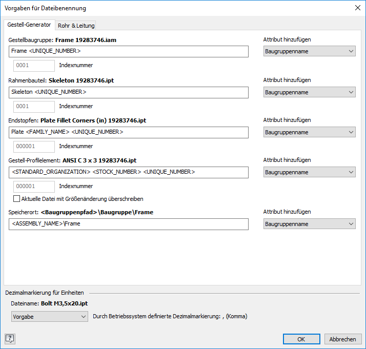 Wenn ein Warnsymbol neben dem Wertfeld angezeigt wird, prüfen Sie die QuickInfo der Meldung und Ihr Benennungsschema auf potenzielle Probleme. Wenn Sie beispielsweise eine Indexnummer anstelle einer eindeutigen Nummer verwenden, kann dies zu doppelten Dateinamen führen.