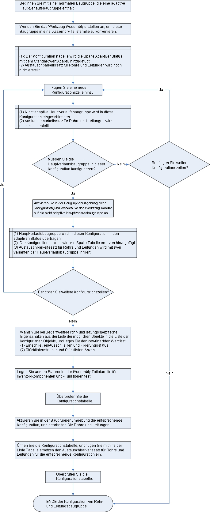 Das folgende Ablaufdiagramm zeigt einen allgemeinen Arbeitsablauf für das Erstellen einer iAssembly-Teilefamilie für Rohre und Leitungen und für das Bearbeiten des Austauschbarkeitssatzes für Rohre und Leitungen.