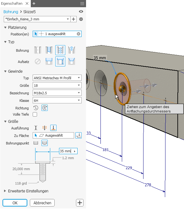 Der Befehl Bohrung bietet einen vereinfachten Arbeitsablauf und Voreinstellungen für die Bohrung zum einfachen Wiederverwenden.