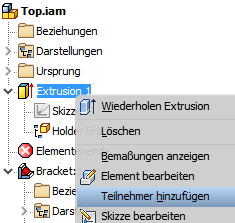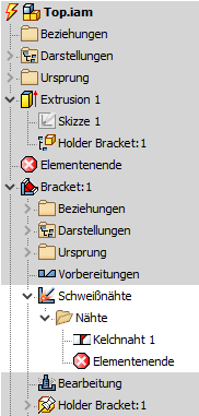 1. Öffnen Sie eine Baugruppe mit einer Schweißkonstruktions-Unterbaugruppe, die keine Schweißnähte besitzt. 2. Erstellen Sie ein Element in der obersten Baugruppenebene. 3. Aktivieren Sie die Unterbaugruppe, und erstellen Sie eine Schweißnaht. 4. Klicken Sie mit der rechten Maustaste auf das Element, das Sie in der obersten Baugruppenebene erstellt haben, und wählen Sie Teilnehmer hinzufügen aus. 5. Erweitern Sie den Schweißknoten in der Unterbaugruppe, und wählen Sie den Ordner Nähte im Browser aus, oder wählen Sie die Schweißnaht im Grafikfenster aus, um sie als Teilnehmer in der Baugruppe der obersten Ebene hinzuzufügen (NEU).