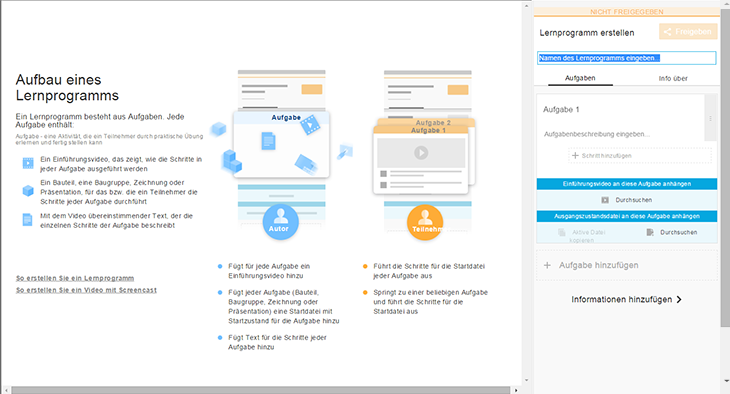 Wenn Sie auf Lernprogramm erstellen klicken, um den Vorgang zu starten, wird ein visuelles Hilfsmittel, Anatomy of a Tutorial (Aufbau eines Lernprogramms), angezeigt. Klicken Sie auf dieser Seite auf die Links zu den Vorgehensweisen, um zwei kurze Videos anzusehen, die das Erstellen und Freigeben veranschaulichen.