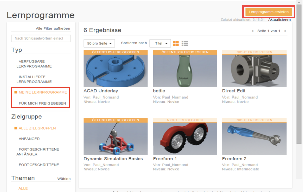 Sie können jetzt Ihre eigenen Lernprogramme erstellen und öffentlich oder privat freigeben. Aufgrund dieser Erweiterung gibt es zwei neue Kategorien unter Typ. Klicken Sie auf Meine Lernprogramme, um die von Ihnen erstellten Lernprogramme anzuzeigen und zu verwalten. Klicken Sie auf Für mich freigegeben, um die Lernprogramme anzuzeigen, die privat für Sie freigegeben wurden.