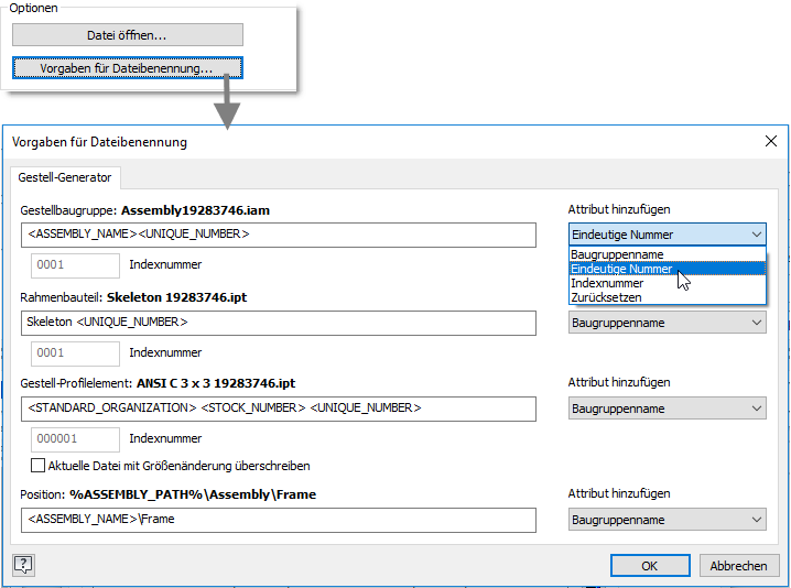 Klicken Sie im Dialogfeld Vorgaben für die Dateibenennung auf die Dropdown-Listen Attribut hinzufügen, um das Benennungsschema zu konfigurieren.