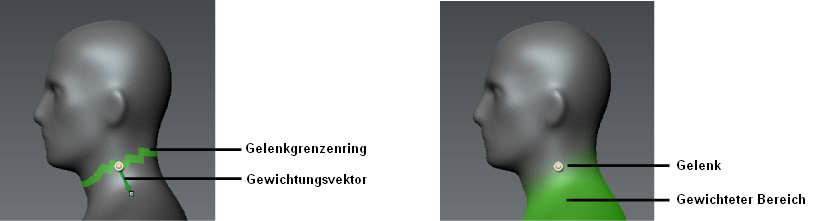 Mithilfe der Optionen Gewichtungen in den Eigenschaften für Gelenk erstellen können Sie verschiedene Methoden zum Einstellen dieses ersten gewichteten Bereichs wählen. Sie können den gewichteten Bereich auch mit dem Werkzeug Gewichtungen anpassen. Siehe Anpassen des Einflussbereichs an einem Gelenk.