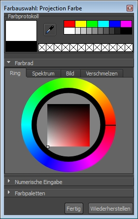 Im Abschnitt Farbprotokoll wird die aktuell ausgewählte Farbe angezeigt. Er bietet eine Vielzahl von Methoden zum schnellen Wählen und erneuten Wählen vorhandener Farben in der Szene.