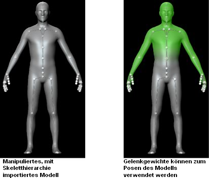 Modelle mit Skelett- (bzw. Gelenk-) Hierarchien, die mit anderen 3D-Anwendungen manipuliert wurden, können mit den zugehörigen Gelenkdaten importiert werden, vorausgesetzt, die andere Anwendung kann das FBX-Dateiformat exportieren. Zum Beispiel können Sie in Maya, 3ds Max und Softimage Gelenkmanipulationen erstellen und FBX-Dateien exportieren.