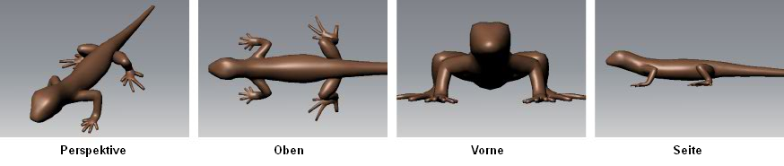 Beim ersten Start von Mudbox betrachten Sie die Szene durch eine perspektivische Kamera. Diese Kamera können Sie unter dem Namen Perspektive in der Objektliste finden. Die Kameras Ansicht von vorn, Ansicht von oben und Ansicht von der Seite werden unter dem Oberbegriff Orthogonale Kameras geführt. Sie können auch zusätzliche Kameras erstellen.
