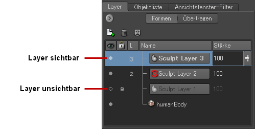 Sie können die Anzeige für einen Formen-Layer aktivieren bzw. deaktivieren, damit Sie diesen Layer nicht versehentlich ändern oder um zu sehen, wie das Modell ohne die geformten Objekte dieses Layers angezeigt wird.