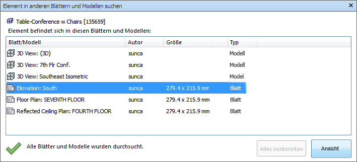 Die Beschriftung oben im Fenster zeigt das Objekt an, das aktuell in der Szenenansicht ausgewählt ist. Der Geometrietyp wird mit einem Symbol neben den Namen des Objekts dargestellt. Die Symbole entsprechen den im Fenster Auswahlstruktur verwendeten Symbolen. Die Suchergebnisse werden in der Liste Blätter/Modelle angezeigt und enthalten alle Blätter/Modelle in der aktuell geöffneten Datei, in der das ausgewählte Objekt gefunden wurde. Sie können die Ergebnisse sortieren, indem Sie auf die Überschrift der gewünschten Spalte klicken. Auf diese Weise wird die Sortierreihenfolge zwischen aufsteigend und absteigend umgeschaltet.