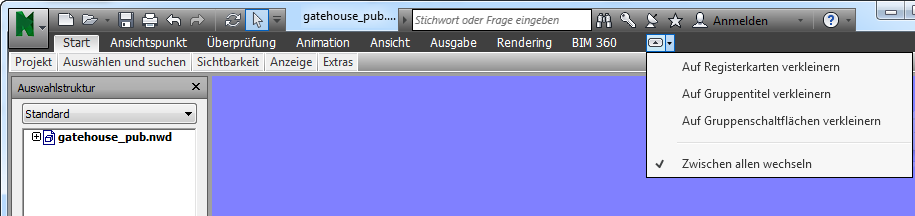 - Zwischen allen wechseln: Wechselt zwischen allen vier Multifunktionsleisten-Zuständen in folgender Reihenfolge: Vollständige Multifunktionsleiste, Auf Gruppenschaltflächen verkleinern, Auf Gruppentitel verkleinern, Auf Registerkarten verkleinern.