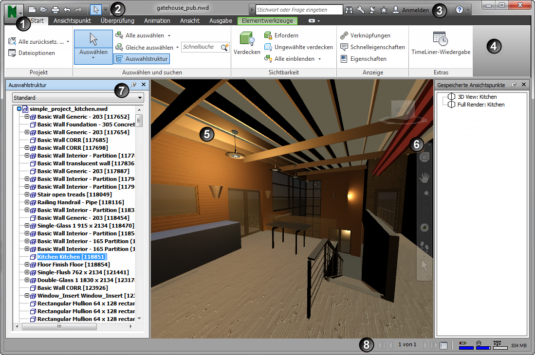 In diesem Abschnitt werden kurz die Hauptkomponenten der Standardbenutzeroberfläche von Autodesk Navisworks beschrieben.