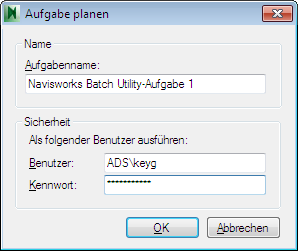 - Ändern Sie ggf. den Namen der Aufgabe im Dialogfeld Aufgabe planen, und geben Sie Ihren Benutzernamen und Ihr Kennwort ein. Klicken Sie auf OK.
