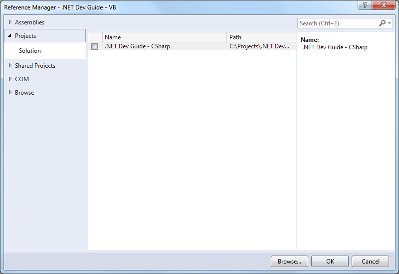 3. In the Add Reference dialog box, Projects tab, select the project you want to reference. Click OK.