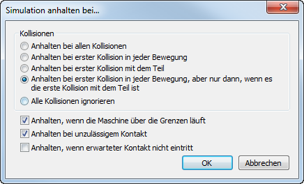 - Anhalten bei erster Kollision in jeder Bewegung aus, um eine Fehlermeldung anzuzeigen und die Simulation bei der ersten Kollision in einer Tasterbewegung anzuhalten. Die darauffolgenden Kollisionen in der Bewegung werden ignoriert.