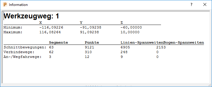 Klicken Sie auf die Werkzeugweg-Registerkarte > Information-Gruppe > Eigenschaften, um den Namen, die Schnitttiefe und die Informationen zu den Schnittbewegungen für den aktiven Werkzeugweg anzuzeigen.