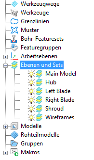 Um einen Blisk zu bearbeiten, muss jede Blisk-Komponente in eine Reihe von Ebenen oder Sets gruppiert werden. Das Modell in diesem Beispiel enthält die erforderlichen Ebenen und Sets.