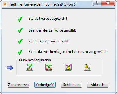 Setzen Sie den Fließlinienkurvendefinition-Dialog ein, um die Kurven, die für einen Fließlinienschlichtwerkzeugweg verwendet werden, festzulegen.