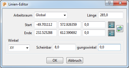 - Winkel – Definiert den Winkel der Linie über Scheinwinkel und Höhenwinkel der gewählten Ebene.