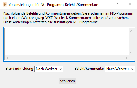 Im Dialogfeld Voreinstellungen für NC-Programm-Befehle/Kommentare können Sie Befehle und Kommentare angeben, die in das NC-Programm aufgenommen werden sollen.