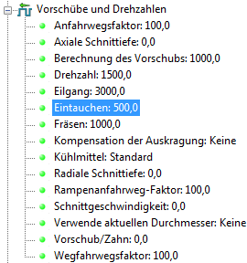 Die Auswirkungen Ihrer Änderungen werden erkennbar, wenn Sie einen der Werkzeugwege auswählen und das Vorschub u. Drehzahl-Element im Explorer Fenster erweitern.
