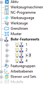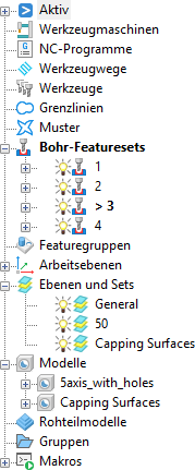 PowerMill erkennt die ausgewählten Bohrungen und erstellt mehrere Bohr-Featuresets.