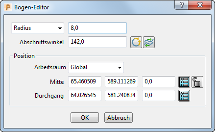 Verwenden Sie den Bogen-Editor-Dialog, um einen Bogen oder Kreis zu ändern. Um den Bogen-Editor-Dialog zu öffnen, doppelklicken Sie auf einen Bogen, wenn die Kurveneditor-Registerkarte angezeigt ist.