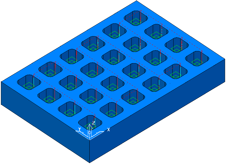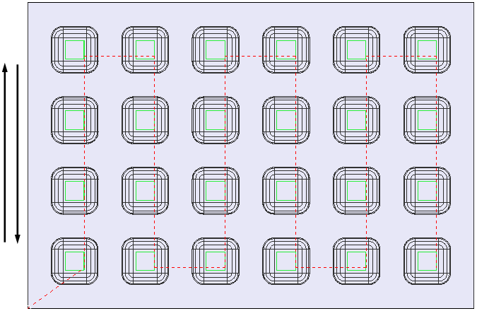 Dieses Beispiel basiert auf dem Entlang X eine Richtung in Y-Beispiel und erstellt einen Werkzeugweg mit einer Werkzeugwegreihenfolge von 'Entlang X Beide Richtungen in Y'.