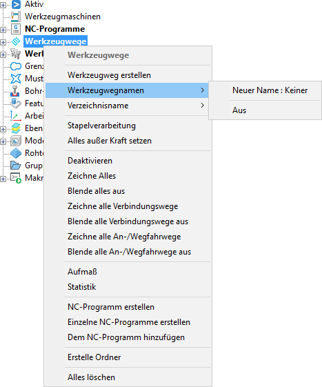 Klicken Sie mit der rechten Maustaste auf ein individuelles Element, um das Kontextmenü für das spezifische Element anzuzeigen. Klicken Sie z. B. mit der rechten Maustaste auf einen Werkzeugweg, um die Optionen, die für diesen bestimmten Werkzeugweg verfügbar sind, anzuzeigen.