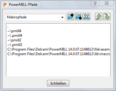 Das Dialogfeld PowerMill-Pfade wird geöffnet und zeigt alle Vorgabe-Makropfade an. PowerMill sucht automatisch nach Makros, die in diesen Ordnern abgelegt sind, und zeigt sie im Explorer an.