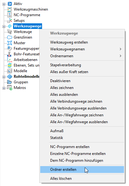 Ordner erstellen – Wählen Sie dies, um einen Ordner mit der Bezeichnung Ordner1 zu erstellen. Sie können diesen Ordner ganz normal umbenennen und Elemente eines bestimmten Typs in den Ordner ziehen und ablegen (z. B. Werkzeugwege in einen Werkzeugwegordner).