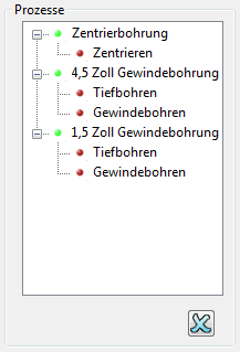 Sie haben ein nun Bohrverfahren mit Bohrprozessen fürs Bohren und Gewindebohren zweier Bohrungsgrößen auf dem Modell erstellt. Erweitern Sie die Prozesse im Bohrverfahren-Dialog, um sie anzuzeigen.