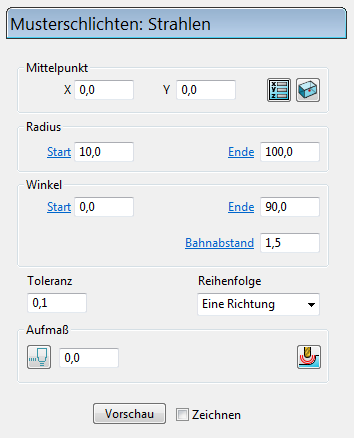 Auf Blockmitte rücksetzen — Klicken Sie, um das radiale Muster automatisch auf der Blockmitte zu zentrieren.Dieser Werkzeugweg verfügt über einen Startradius von 10 und einen Endradius von 100.