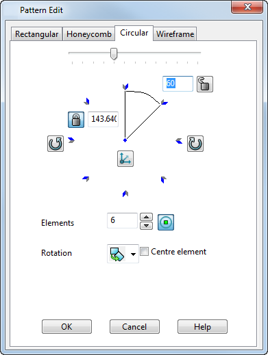 Musterradius einstellen - Geben Sie den erforderlichen Radius der Elemente um die Musterursprungsachse ein und drücken Sie entweder die Eingabe- oder dieTabtaste. Das Muster wird angepasst, um den eingegebenen Wert wiederzuspiegeln. Diese Option ist nur verfügbar, wenn
