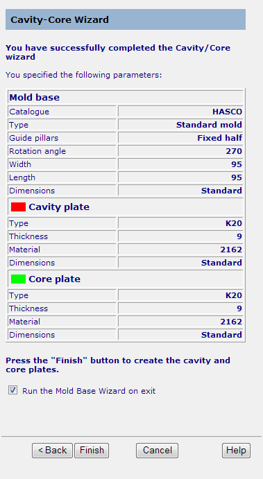 - Wenn Sie den Formenaufbau-Assistenten ausführen möchten, nachdem die Kern- und Formhalteplatten erstellt wurden, wählen Sie die Option Formenaufbau-Assistenten beim Beenden ausführen aus.