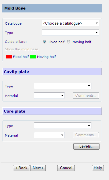 - Formhalteplatte – Wählen Sie den Typ und das Material für die Formhalteplatte aus, die im Katalog verfügbar ist.